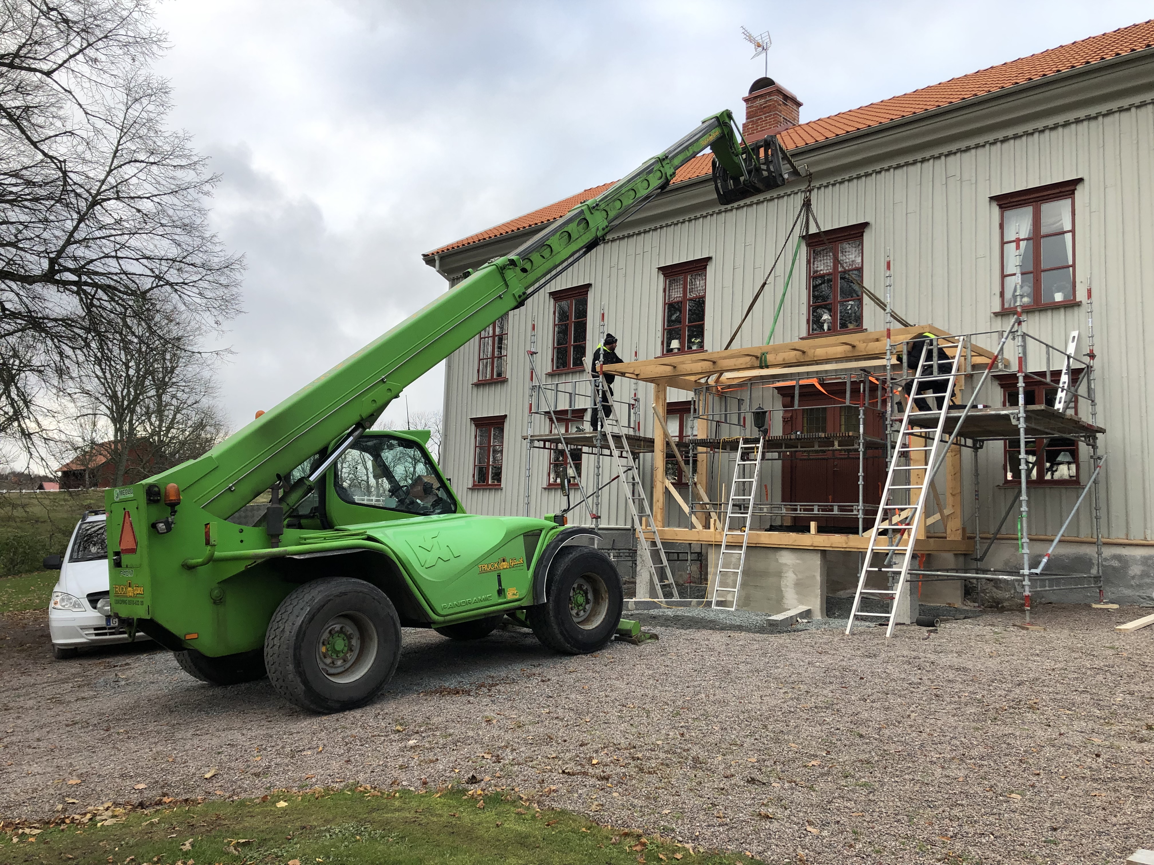 Nybyggnation av ursprunglig veranda på mangårdsbyggnaden.